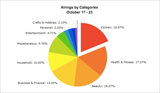 Two weeks ago a substantial upsurge in Kitchen airings pushed the category past Beauty to take the number two position. But Kitchen didn’t stop there. With an increase of nearly 40 more airings last week, Kitchen surpassed Health & Fitness to become the most frequently aired category on national cable. Side note (and probably another trend for us to research): Health & Fitness usually doesn't surge until after the holidays.