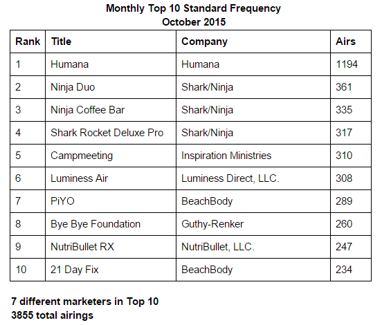 While the Top 10 for October 2015 had fewer marketers, it had a greater number of total airings. It should be noted that Media Analytics did not actively track Ministry programming in 2014. So what if Ministry programming was eliminated from this year’s ranking? Then Campmeeting would be gone and Shark Powered Lift Away, with 229 airings, would ascend into the Top 10. That’s right, another Shark/Ninja infomercial.
